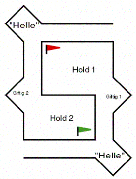 Man befinder sig i et giftigfelt, når man står med begge fødder inde i trekanten, markeret ved siden af gangarealet.